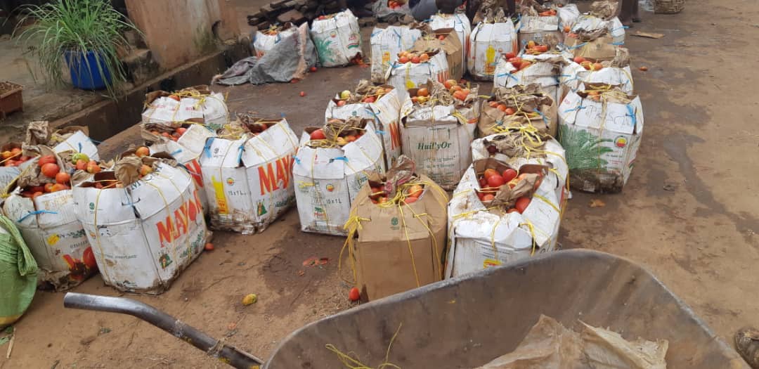 The ” Marche 8eme” in Yaounde specialized in the sales of large amounts of vegetables and spices is the epicentre of the tomato flood. Before the COVID-19 crisis, this market used to receive about 50 truck loads of tomatoes daily, said Joseph Kana, member of the Association of tomato vendors. But today he said about 150 to 180 trucks bring in tomatoes, causing the supply to be far more than the demand. This has caused them to adopt the mobile sales of tomatoes.